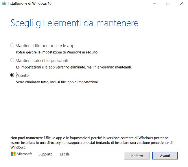 Come si vede nell’immagine riprodotta in figura l’unica opzione selezionabile è Niente: l’utente può reinstallare Windows 10 ma tutti i dati e le applicazioni saranno automaticamente rimossi.