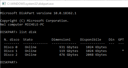 Digitando list disk si otterrà la lista delle unità, interne ed esterne, collegate con il sistema in uso.