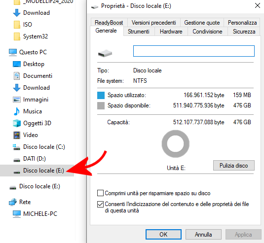 Individuando l’unità esterna e cliccando su di essa, si possono verificare le partizioni eventualmente presenti.