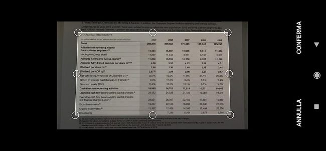 2) Inquadrare con la fotocamera dello smartphone la porzione del documento cartaceo contenente la tabella che si desidera importare in Excel sotto forma di foglio elettronico.