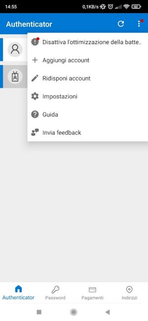 Dopo aver scaricato e installato l’app Microsoft Authenticator sul proprio dispositivo mobile basta toccare i tre puntini in alto a destra quindi selezionare Aggiungi account.