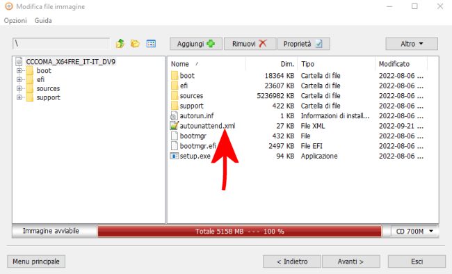 7) Cliccando su Avanti, si deve assegnare un nome al file ISO personalizzato contenente tutti i file di Windows 11 originali e il file autounattend.xml che si è provveduto ad aggiungere.
