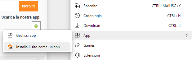 Con Edge è possibile ottenere lo stesso risultato cliccando sul menu principale in alto a destra quindi su App, Installa il sito come un’app.
