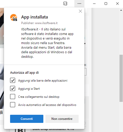 Cliccando su Installa Edge chiede se il sito debba essere aggiunto alla barra delle applicazioni, al menu Start, come icona sul desktop e se vada aperto a ogni avvio del sistema.