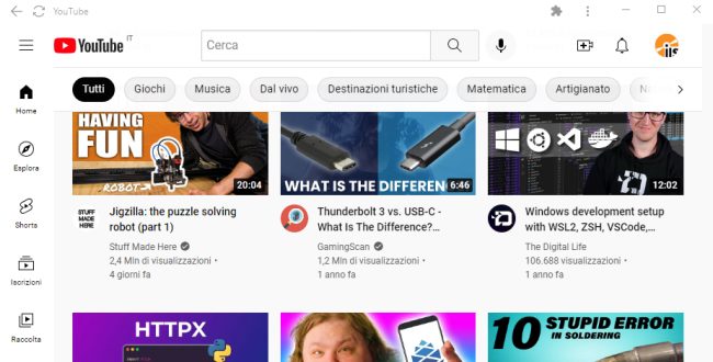 Come si vede nell’immagine, installare YouTube da browser significa rendere accessibile il servizio di Google cliccando su un semplice collegamento creato a livello di sistema operativo. L’icona di YouTube viene aggiunta nel menu Start e visualizzata nella barra delle applicazioni di Windows.