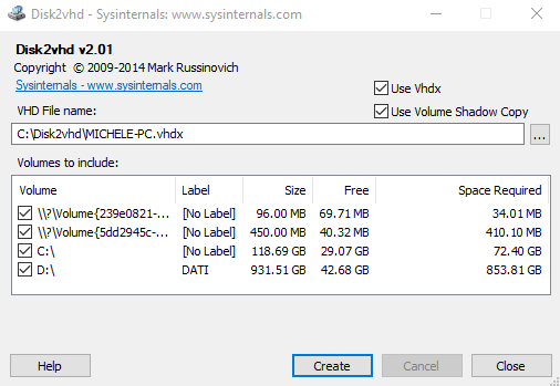 Dopo aver avviato Disk2vhd si potranno selezionare le unità da includere nel file VHD/VHDX. È importante selezionare non soltanto l’unità contenente il sistema operativo ma anche i volumi di sistema (contrassegnati dalle indicazioni \?\Volume): diversamente il boot della macchina virtuale non avverrà.