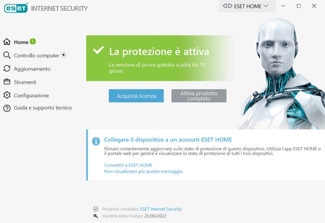 Diversamente rispetto a Bitdefender, ed è questo un aspetto positivo, ESET non obbliga gli utenti a creare subito un account anche se ciò viene consigliato per abilitare le funzioni di gestione remota da pannello di controllo Web.