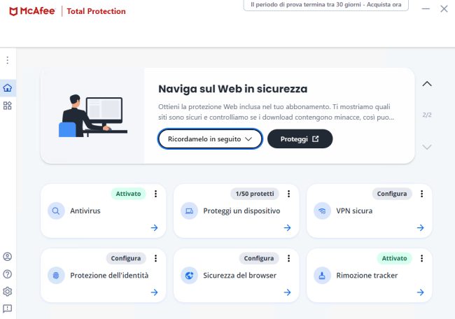 Purtroppo, diversamente da Bitdefender, McAfee non offre una versione gratuita dell’antivirus ma soltanto una versione di prova valida per 30 giorni dal momento dell’installazione.