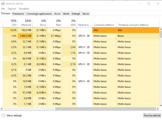 Con Windows 10 Aggiornamento di ottobre 2018 il Task Manager del sistema operativo si è arricchito di un’utile funzionalità: premendo la combinazione di tasti CTRL+MAIUSC+ESC, cliccando su Più dettagli quindi sulla scheda Processi, si troveranno sulla destra le nuove colonne Consumo elettrico e Tendenza consumo elettrico.