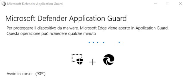 Al primo avvio apparirà un messaggio simile a quello riprodotto in figura: basterà attendere qualche istante. Comparirà quindi una finestra del browser con l’icona Application Guard a destra della barra degli indirizzi: significa che la navigazione è completamente separata dal resto del sistema.
