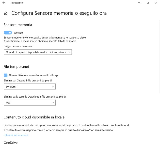 L'”interruttore” Sensore memoria può liberare automaticamente spazio su disco…, il primo che si trova sotto il titolo Archiviazione consente di rimuovere automaticamente oggetti inutili allorquando lo spazio disponibile su hard disk o SSD iniziasse a scarseggiare.