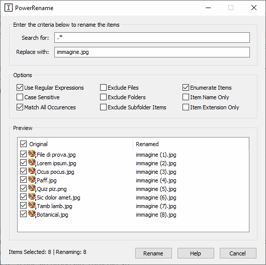 Impostando un nome nella casella Replace quindi spuntando anche Enumerate Items, PowerRename rinominerà tutti i file usando la stringa specificata quindi assegnerà un numero progressivo a ciascun elemento.
