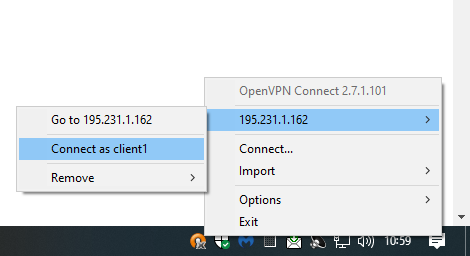 Nel nostro caso abbiamo installato il client OpenVPN per Windows: al termine dell’installazione cliccando con il tasto destro sull’icona mostrata nella traybar quindi selezionando l’IP del server e Connect as…, verrà immediatamente stabilita una connessione remota.