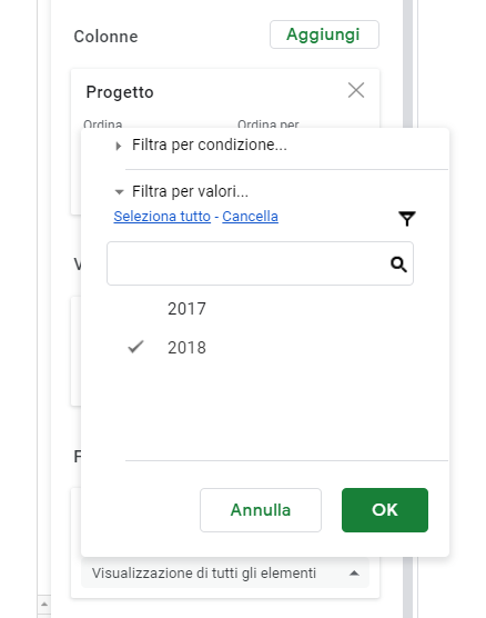 A questo punto ciò che resta da fare è applicare un filtro per estrarre solamente i dati relativi alle attività svolte nel 2018. Per procedere in tal senso e impostare un filtro sull’anno, basta cliccare su Aggiungi in corrispondenza della voce Filtri, scegliere Anno quindi lasciare selezionato solo 2018.