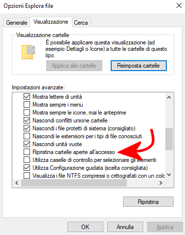 Se si volessero automaticamente ripristinare, al successivo riavvio di Windows 10, le cartelle di Esplora file aperte, è possibile premere la combinazione di tasti Windows+R, digitare rundll32.exe shell32.dll,Options_RunDLL 0, premere Invio, cliccare sulla scheda Visualizzazione quindi spuntare la casella Ripristina cartelle aperte all’accesso.