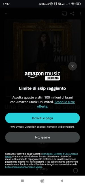Provando a saltare da una “traccia” all’altra Amazon Music improvvisamente impedisce ulteriori operazioni simili e invita l’utente a valutare l’abbonamento al piano Unlimited a 9,99 euro mensili.