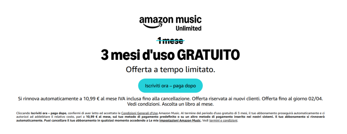 Insomma, niente da invidiare rispetto a Spotify. E c’è di più: una volta terminata la prova gratuita, Amazon Music costa comunque meno: 10,99€ al mese invece degli 11,99€ mensili richiesti dalla piattaforma svedese. Ovviamente senza alcun vincolo di rinnovo.