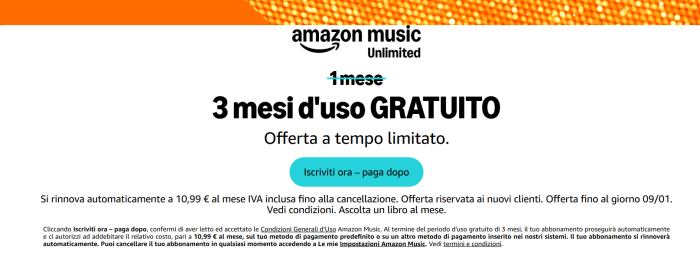 L’iniziativa è riservata esclusivamente a chi non è abbonato ad Amazon Prime e non ha mai attivato in passato Amazon Music Unlimited. In questo caso, è possibile accedere gratuitamente al servizio per 3 mesi consecutivi, pari a 90 giorni di utilizzo completo, con la libertà di interrompere l’abbonamento in qualsiasi momento. Chi invece è già stato cliente o ha già provato la piattaforma, può comunque usufruire di condizioni agevolate per tornare ad abbonarsi.