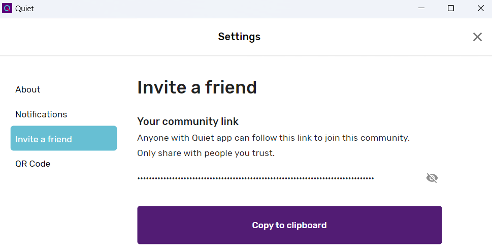 Al primo avvio di Quiet, si può cliccare su Create a new community e assegnare un nome alla nuova comunità. Successivamente è possibile invitare altri utenti. È possibile farlo cliccando sul nome della comunità, in alto a sinistra, quindi selezionando Invite a friend e infine Copy to clipboard.