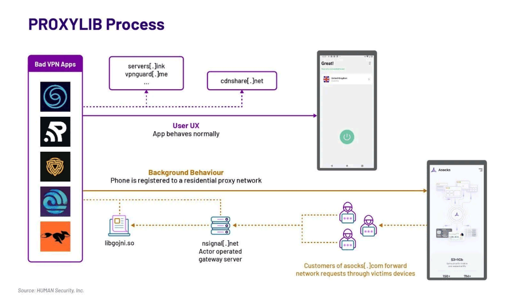 Gli analisti di HUMAN-Satori riferiscono che le app VPN per Android in questione utilizzano un kit di sviluppo software (SDK) fornito da LumiApps che conteneva Proxylib, una libreria Golang per attivare la funzionalità di proxying.