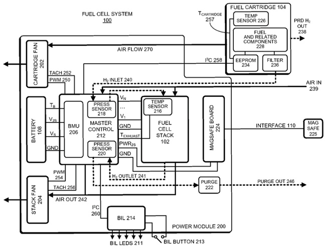 La Mela sembrerebbe aver davvero proseguito le ricerche e gli esperimenti perché, nella richiesta di registrazione di brevetto presentata all’ufficio competente negli Stati Uniti ed appena resa pubblica (vedere questa pagina), i tecnici di Apple parlano proprio di celle a combustibile.