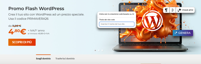 In questo momento non c’è un hosting più conveniente di Aruba per chi vuole creare un sito WordPress. Fino al 29 aprile, è possibile usufruire di uno sconto del 60% e prezzo a partire da 4,80€ per il primo anno (invece di 11,90€).