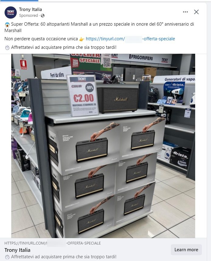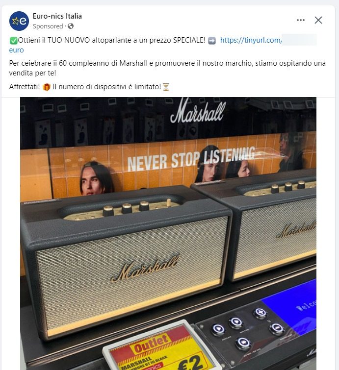 Guardate l’immagine inviataci da un lettore: a una prima occhiata, Trony sembra offrire alcune decine di speaker Marshall a un “prezzo folle”. Come si vede, il messaggio pubblicitario è Sponsored: si tratta cioè di un’inserzione veicolata attraverso la piattaforma di advertising Meta. Nel caso di Trony la pagina Facebook si chiama tronyitali (senza la “a” finale): a un occhio attento non dovrebbe sfuggire.