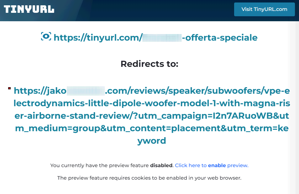 Il link facente riferimento a tinyurl.com dovrebbe immediatamente destare ben più di qualche sospetto. Non perché un servizio come TinyURL, che consente di abbreviare gli URL, sia un problema in sé ma perché Trony, Unieuro ed Euronics difficilmente se ne servirebbero. Inoltre, basta un trucco da utenti (leggermente) smaliziati per scoprire subito la magagna: provando a sostituire preview.tinyurl.com a tinyurl.com, si può accertare subito l’indirizzo di destinazione, senza neppure visitarlo.