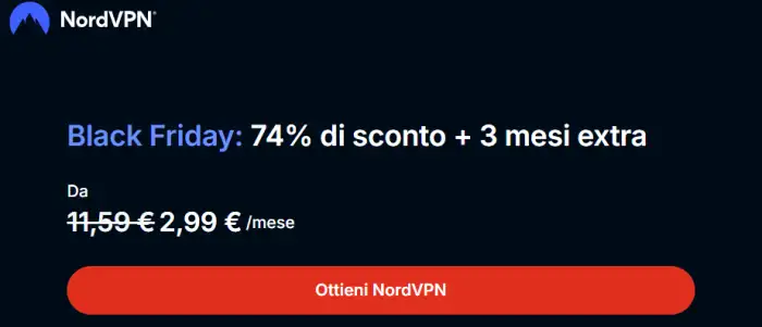 Se stavi pensando di proteggere la tua connessione e rendere la tua navigazione più libera, il momento migliore è arrivato. Il Black Friday porta con sé un’occasione davvero rara: NordVPN offre il 74% di sconto + 3 mesi gratis sul piano più completo, quello che include tutti gli strumenti di sicurezza e di velocizzazione della connessione. È una di quelle offerte che non si vedono due volte nello stesso anno.