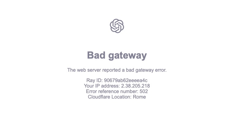 Come un fulmine a ciel sereno improvvisamente il celebre assistente AI di OpenAI, ChatGPT ha deciso di prendere (si spera) qualche ora di permesso. Proprio così: il chatbot non funziona e a tutti coloro che provano a connettersi, restituisce il messaggio “Bad gateway“, con tanto di logo ufficiale.