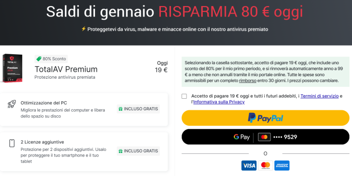 Se cerchi un antivirus da poter usare su più dispositivi, TotalAV Premium è una delle soluzioni più interessanti dell’anno. Grazie alla promozione attuale, la licenza annuale è disponibile a 19 euro invece di 99, con un risparmio di 80 euro.