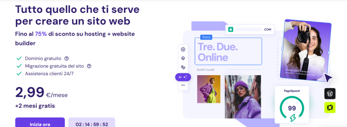 In questo momento è difficile trovare una promozione più interessante di Hostinger per la creazione del tuo nuovo sito web. Con il 75% di sconto e al prezzo a partire da 2,99€ al mese con 3 mesi extra gratis puoi ottenere un hosting con website builder dotato di AI. E hai anche 30 giorni di garanzia di rimborso.