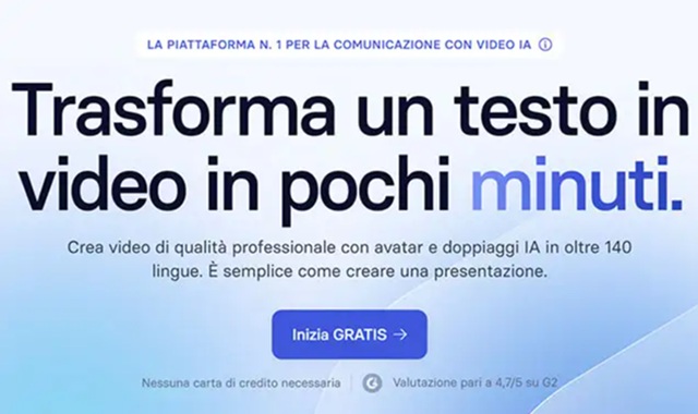Synthesia, leader a livello globale tra le piattaforme di comunicazione video AI, consente di realizzare video professionali con avatar virtuali in 140 lingue diverse, permettendo alle aziende di risparmiare fino all’80% sia in termini di spesa che di tempo. Per provare le sue funzionalità senza impegno è sufficiente iscriversi alla piattaforma tramite l’account Free: in seguito, le versioni più complete partono da 16 euro al mese (piano Standard).