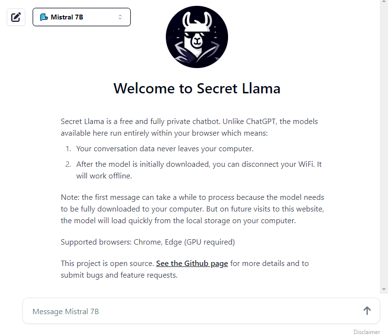Infine, Secret Llama è contraddistinto da un’interfaccia semplicissima da usare: in basso c’è il classico riquadro per l’inserimento dell’input da inviare al chatbot; con il pulsante in alto a destra si può avviare una nuova chat; il menu a tendina sulla destra permette di scegliere il LLM (Large Language Model) preferito.