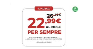 Chi è già cliente mobile Iliad o decide di diventarlo può accedere al vantaggio Fibra + Mobile, ottenendo uno sconto sul canone fibra: il prezzo standard è di 26,99€ al mese, ma può scendere a 22,99€ al mese per sempre per chi abbina un’offerta mobile Iliad compatibile.