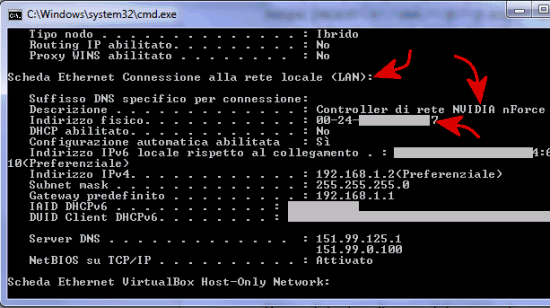 In corrispondenza di Scheda Ethernet Connessione alla rete locale (LAN), si troverà il MAC address da utilizzare (Indirizzo fisico):