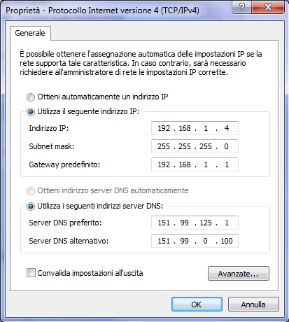 L’opzione Ottieni automaticamente un indirizzo IP non dev’essere selezionata ma deve essere invece specificato un IP statico compatibile con la configurazione degli indirizzi all’interno della rete locale.