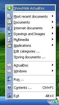 Facendo clic con il tasto destro del mouse sull’icona di ActualDoc, visualizzata nell’area della traybar di Windows, è possibile richiamare quella che appare come una versione potenziata del menù Documenti recenti offerto da parte del sistema operativo.