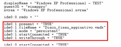 Nel file .vmx della “virtual machine” alla quale si desidera connettere un nuovo hard disk virtuale, si aggiungano – immediatamente sotto la riga ide0:0.redo = "" – le informazioni precedentemente copiate in memoria, negli Appunti.