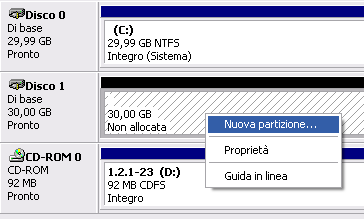 Affinché il nuovo disco sia visibile ed utilizzabile in Windows, basta farvi clic con il tasto destro del mouse (viene mostrata l’indicazione Non allocata) e scegliere il comando Nuova partizione.