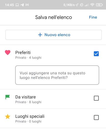 Anziché usare il pulsante Condividi luogo si dovrà selezionare Salva e, ad esempio, spuntare la voce Preferiti.