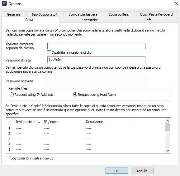 Nella scheda Amici, si possono indicare gli indirizzi IP privati o i nomi dei dispositivi Windows autorizzati a inviare informazioni. Togliendo il segno di spunta dalla casella Disabilita la ricezione di clip, si autorizza qualunque computer locale a inviare appunti verso il sistema in uso.