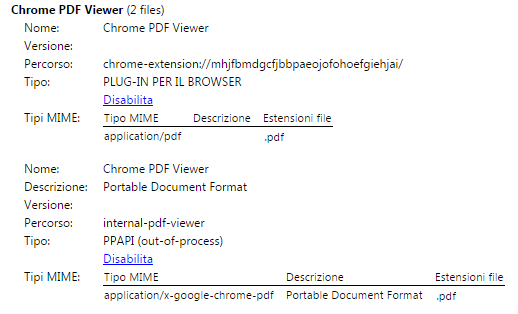 La presenza del visualizzatore integrato in Chrome è confermata dalle seguenti due voci, mostrate nella schermata accessibile digitando chrome://plugins nella barra degli indirizzi del browser.