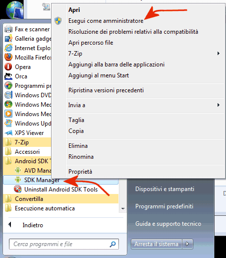 Una volta installato anche il pacchetto Android SDK, si dovrà fare clic sul pulsante Start di Windows quindi individuare e fare clic su SDK Manager. Consigliamo di avviare subito l’applicazione SDK Manager da un account con i diritti di amministratore (su Windows Vista e Windows 7 si dovrà fare clic con il tasto destro del mouse sulla voce SDK Manager quindi selezionare il comando Esegui come amministratore).