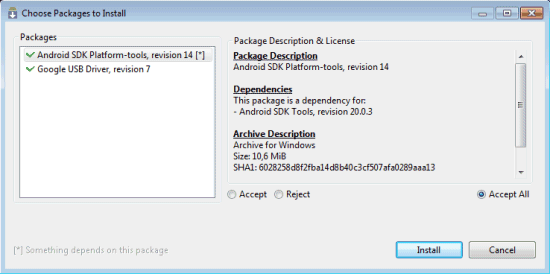 Dalla finestra principale dell’SDK Manager si dovrà spuntare la casella Android SDK Platform-tools quindi fare clic sul pulsante Install packages: