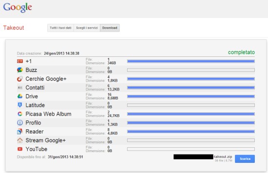 Terminata l’operazione di backup, Google memorizzerà e conserverà per alcuni giorni, sui suoi server, un file che contiene tutte le informazioni dell’utente. Per prelevare il backup (il suo nome sarà -takeout.zip, preceduto dal nome dell’account Google) e memorizzarlo sul sistema locale, è sufficiente fare clic su Scarica.