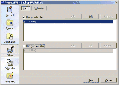 Soffermiamoci invece sui pulsanti Filters, Scheduler e Advanced. Il primo consente di impostare dei filtri che permettano di escludere (o di includere) in modo automatico, all’interno dell’archivio di backup, file e cartelle che rispondono alle caratteristiche specificate.