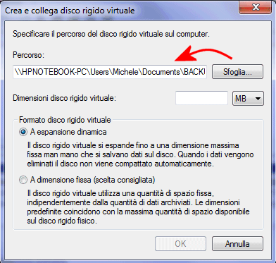 Nel sottostante riquadro Formato disco rigido virtuale suggeriamo di selezionare l’opzione A espansione dinamica. Così facendo, nell’unità di rete specificata nella casella Percorso, non sarà immediatamente occupato tutto lo spazio indicato nel campo Dimensioni disco rigido virtuale (le dimensioni del file VHD cresceranno via a via che si salveranno dei dati).