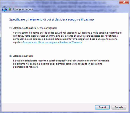 Una volta avviata la procedura passo-passo per la creazione di un backup da Windows 7, scegliendo l’opzione Selezione manuale, si potranno specificare i file e le cartelle oggetto del backup.