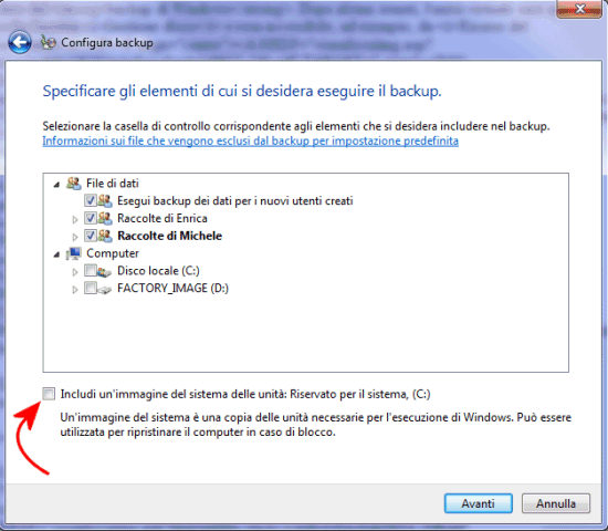 Togliendo il segno di spunta dalla casella Includi un’immagine del sistema delle unità, lo strumento di backup di Windows 7 non includerà più un’immagine del sistema in uso ma si limiterà a salvare solo i file e le cartelle indicati nel riquadro superiore (File di dati e Computer).